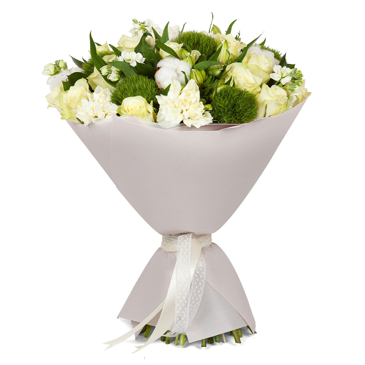 Роза одноголовая белая, маттиола белая, диантус Грин трик, хлопок. Упаковка (лента, пленка, крафт, сетка, пленка матовая)