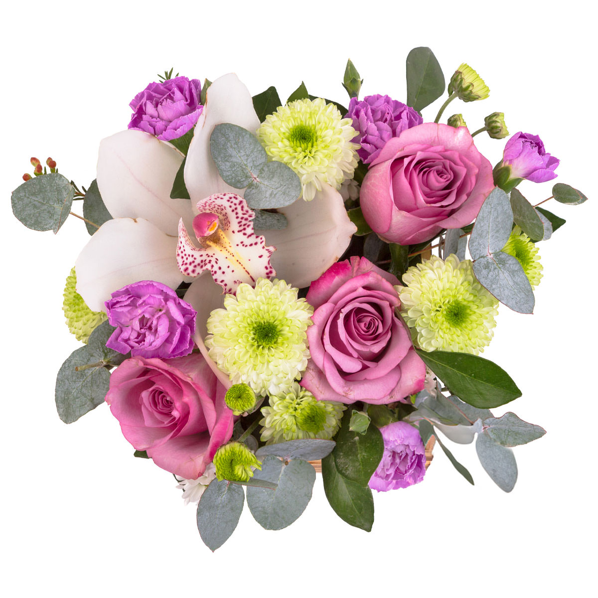 Орхидея белая, роза одноголовая розовая, хризантема кустовая зеленая, гвоздика сиреневая, эвкалипт. Упаковка (Корзина, оазис, ящик).