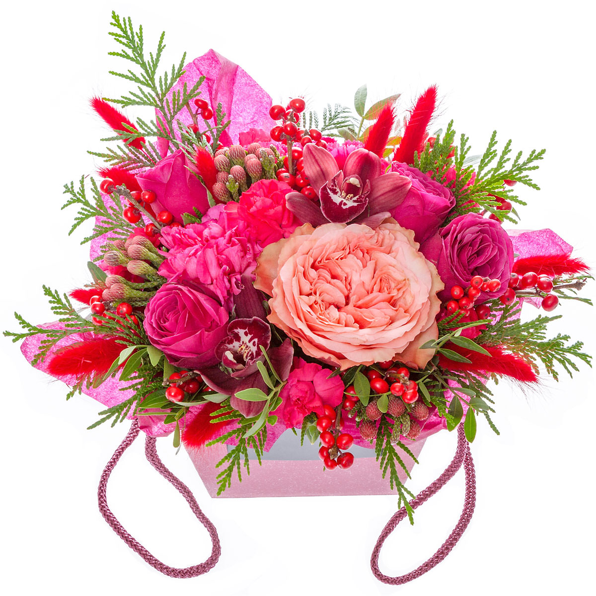 | Состав | Гвоздики, Илекс, Орхидеи, Пионовидные розы, Розы |